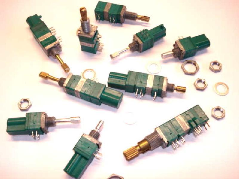 Potentiometri-lajitelma 10 kpl - Alpsin erikoispotikoita 10 kpl. Näissä veto -ja painokytkin ominaisuuksia, useampia liukuja samalla akselilla yms. Eri arvoja ja toimintoja. Pienikokoisia ( esim. autostereoihin suunniteltuja ).
